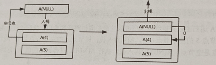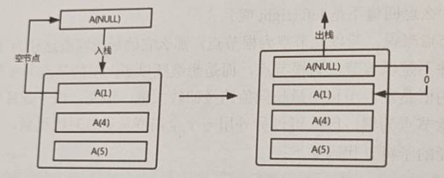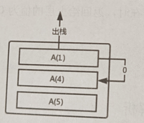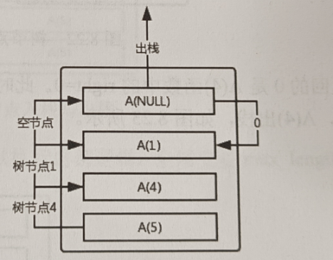 如上图所示,在执行递归函数A的过程中,从调用A(5)到最终返回所求最长同值路径数值的过程如下:首先将函数A(5)压入栈中,在根节点5处其左子节点为4,则将函数A(4)也压入栈中;接着在节点4处再次调用其左子节点1而压入函数A(1);在节点1处再次调用左子节点为空的情况而压入函数A(null);当处理完所有空树结构后(即函数A(null)),其返回值为零并依次向上返回给父层处理:即返回值零对应于上层调用函数A(1)时处理left分支的结果;此时进入right分支处理阶段:即执行right=self.A(root.right),此时同样将函数A(null)压入栈中并完成计算过程。