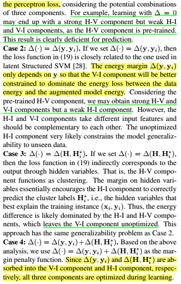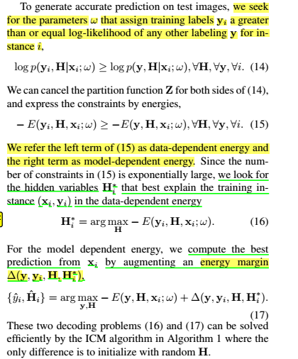 a.对于图像中实例i的预测,对应的标签yi可用14式来求解表示,进一步通过省略两边的分区函数Z,14式可以采用能量的约束形式15式来表示;对于公式15的模型解释,左边描述了数据依赖能量,而右边描述了模型依赖能量。此时,遇到的一个难题是:该模型的约束是指数数量级的?对应我们通过16式来寻找隐含层的变量Hi*能够在数据依赖能量中最好地解释实例(xi,yi)。