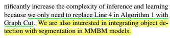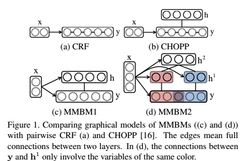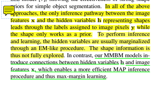 这里首先对现有的方法作了分析,然后指出在上述的提到的方法,在图像特征和隐变量之间的唯一的推理路径推进将标签分配给图像像素,然而却将这个形状仅仅使其作为先验信息起作用,因此这个形状信息没有被完全开发研究。相反,我们的MMBM介绍了隐变量和图像特征间的连接,这种做法使得MAP推断程序更加高效,从而有助于最大边界学习。