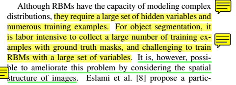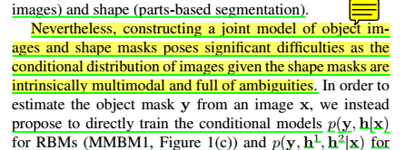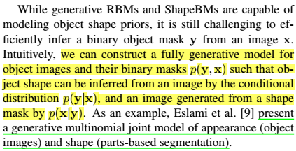 这里RBMs和ShapeBMs有自身的缺点,不能高效的从图像去推断对象的二值掩模(物体的分割);因此,提出可以构建p(x,y)的全生成模型;现有文献提出了基于对象图像和分割部分图像的生成多项式联合模型。