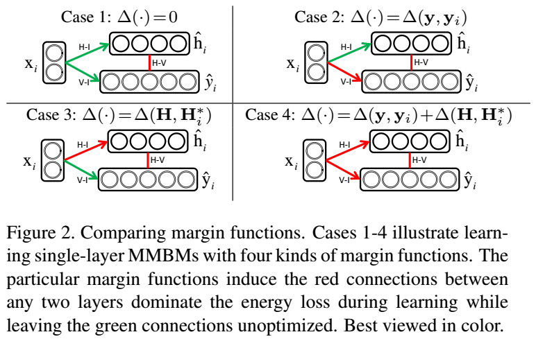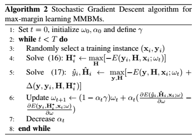 这里对于MMBM的学习给出训练样本{(xn,yn)},单层和双隐含层的MMBM的模型和模型参数;同时阐述MMBM模型由独立图像和依赖图像等两部分组成,进一步说明MMBM学习的步骤(首先通过生成预训练来初始化图像独立部分,然后将问题重新表述为最大边界优化问题,这个问题进一步采用CCCP算法来求解)。