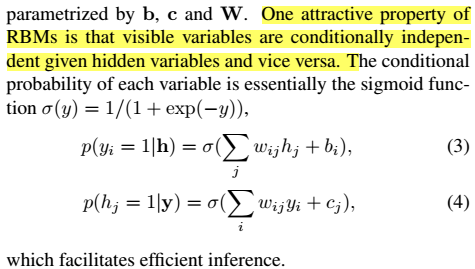RBM的一个优良特性是:在给定隐层变量的情况下,可见变量条件独立的;反之,在给定可见变量的情况下,隐层变量也是条件独立的;隐层和可见层的变量的条件概率可以通过公式3和4来表示。