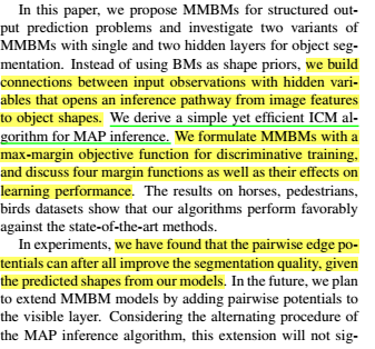 本文提出了针对普适类的条件玻尔兹曼机的对象分割模型,本文模型除了从图像到标签的连接,也包含从图像到隐层变量的连接,这个好处是允许我们从图像特征直接进行形状推断;同时我们也推导出适用于最大后验推断的高效迭代式条件模型。