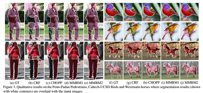 相比已提出的最大边界的玻尔兹曼机主要针对理论的研究,我们提出的方法主要在于图像分割上的应用;同时和基于超像素CRF和基于高阶模式的方法在三种数据集上进行对比分析。