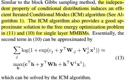 针对条件分布独立的特性,对于单隐含层的MMBMs,本文提出采用高效的迭代条件模型ICM去求解;