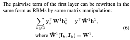 由于第一隐含层连接的是可见变脸层的局部图像块,因此,可将第一隐层变量集合的每部分变量放在一个大的权重矩阵W中,从而改写为公式6;