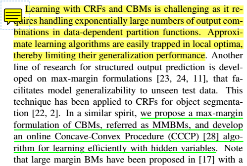 针对CRF和CBM模型面对指数级输出组合的问题,近似学习算法易陷入局部最优解;而我们提出的给予最大边界的CBM能够高效地解决这个问题