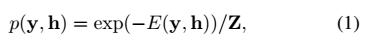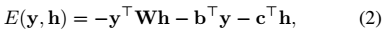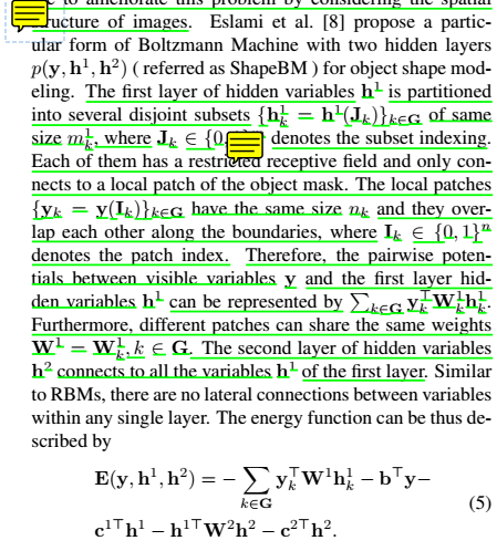 给定一个对象有标签的图像,我们能够将mast表示为可见变量y属于{0,1}的集合;RBMs使用隐层变量h({0,1}n)的一层去捕获可见变量之间的全局依赖性: