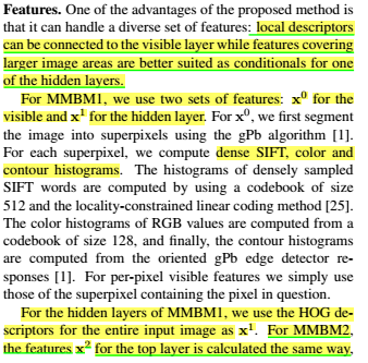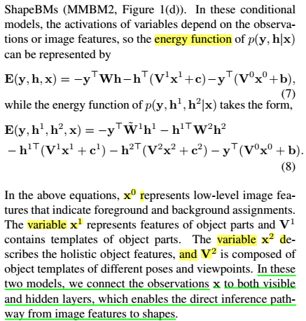 x1(带分割目标的部分的特征);V1是目标部分的模板;x2(描述了对象的整体特征);V2则由不同姿态和视角的对象模板组成;这个模型的特点就是将观察图像x连接到隐含层和可见层,这个优点就是此时我们能够直接从图像特征来推断对象的形状(即分割对象)。