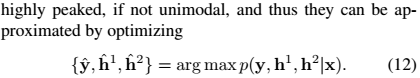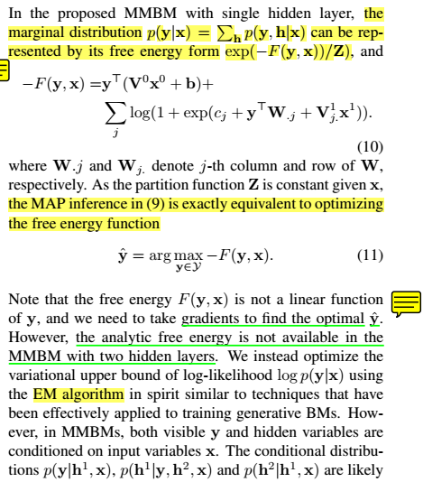 这里主要提出对单层和双隐含层的MMBM的模型求解;对于单隐含层由于边界分布能够用自由能量来表示,因此对于9式的求解可以转化为求解11式,然后采用梯度的方式来寻找最优的y;但是对于双隐含层的MMBM,由于其自由能量不能表述,因此使用EM算法去求解log似然函数log(p(y|x))。如果上述的条件分布不是单峰的,则可由12式来代替;