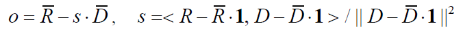 - 解释下公式:s = R块每个Pixel与其均值的差 同 D块每个Pixel与其均值的差 乘积的累加和,除 D块每pixel与其均值差的平方的累加和。 o = R块pixel均值 - D块pixel均值乘上面算出的s。