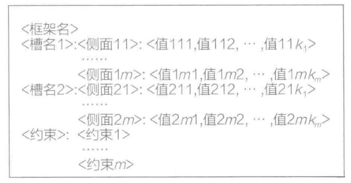 框架是一种描述所论对象(事物、时间或概念)属性的数据结构。框架通常由描述事物的各个方面的槽(Slot)组成。槽用于描述所论对象某一方面的属性。每个槽可以拥有多个侧面(Facet)。每个侧面可以描述相应属性的一个方面,而且每个侧面可以拥有多个值。槽和侧面所具有的属性值分别被称为槽值和侧面值。除了槽、侧面及其值之外,在框架中还可定义约束,用于约束槽和侧面的合理取值。