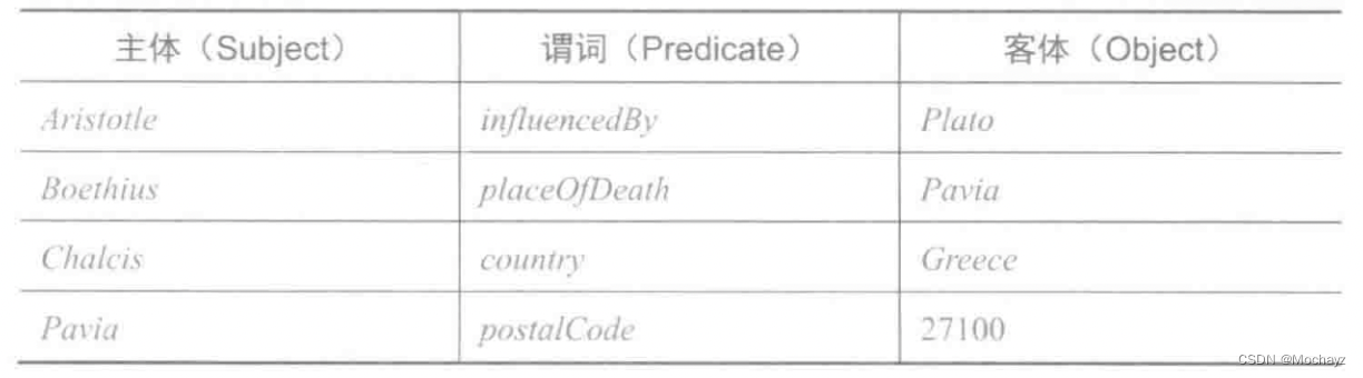 一个三元组包括三个元素:主体(Subject)、谓词(Predicate)及客体(Object)。当某个三元组描述了某个资源的属性时,其三个元素也被称为主体、属性(Property)及属性值(Property Value)。比如,三元组 <亚里士多德,出生地,Chalcis> 表达了亚里士多德出生于 Chalcis 的事实。