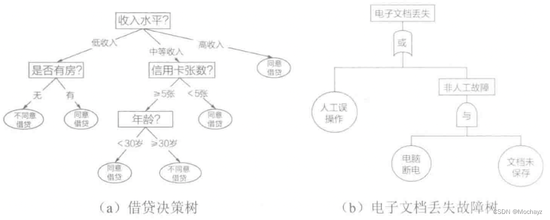 另一类常见的树形知识表示是故障树。故障树是一种树形的逻辑因果关系图。在故障树中,父节点是产生故障的结果,也称输出事件;子节点是产生故障的原因,也称输入事件。为了能够表达因果逻辑关系,逻辑树利用逻辑符号连接子节点和父节点。