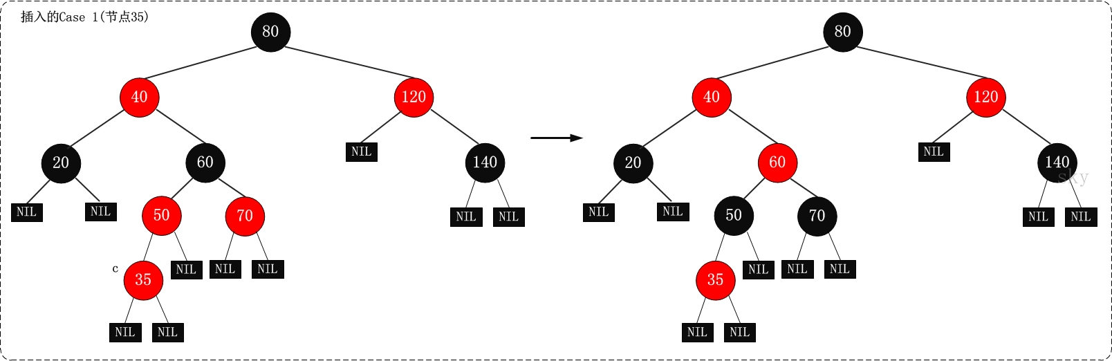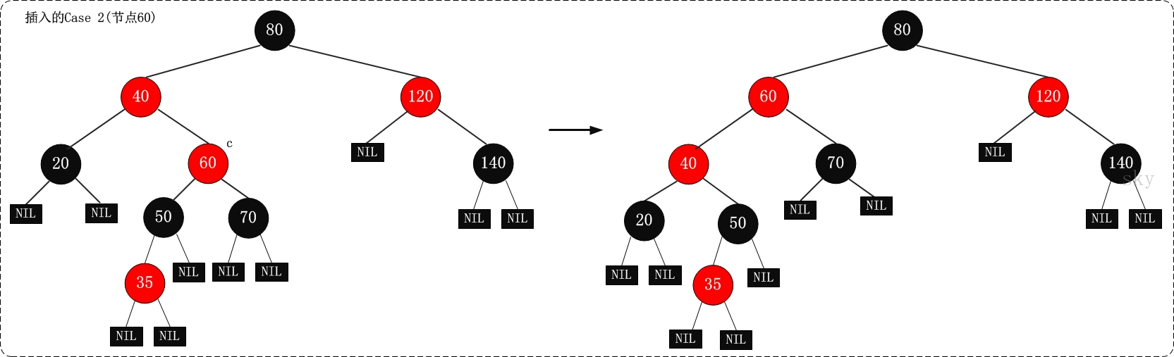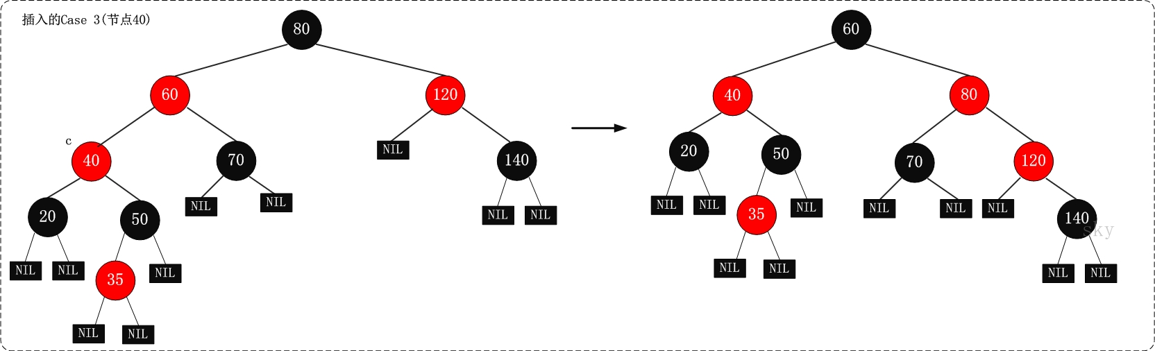 | Case 3 | 当前 nodes 的父是红边连接, 并且其叔叔是黑边连接, 同时当它是其父亲的左子树时 | (01) 首先我们将该父 nodes 的颜色设定为空白; (02) 然后我们将该祖父 nodes 的颜色设置成红色; (03) 最后我们围绕该红祖父 nodes 向右进行调整 |