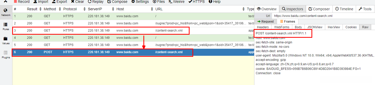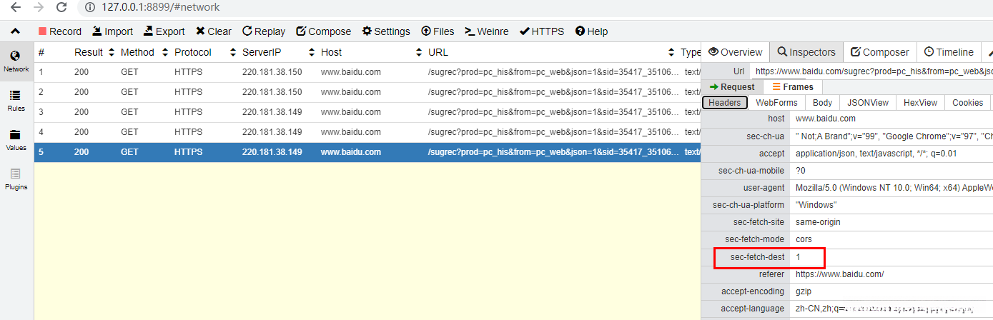 3)发起请求后,查看whistle抓包请求对应的Header改变,如图所示: