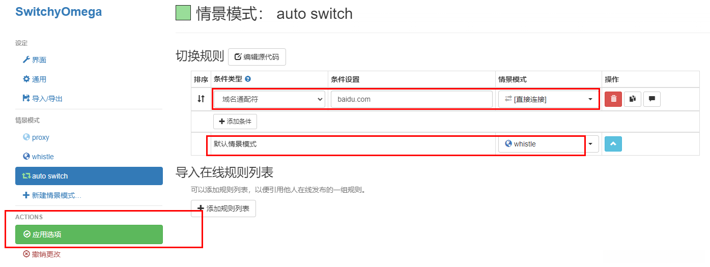 auto switch:可同时支持多个规则,编写完规则后点击【应用选项】,即可使用