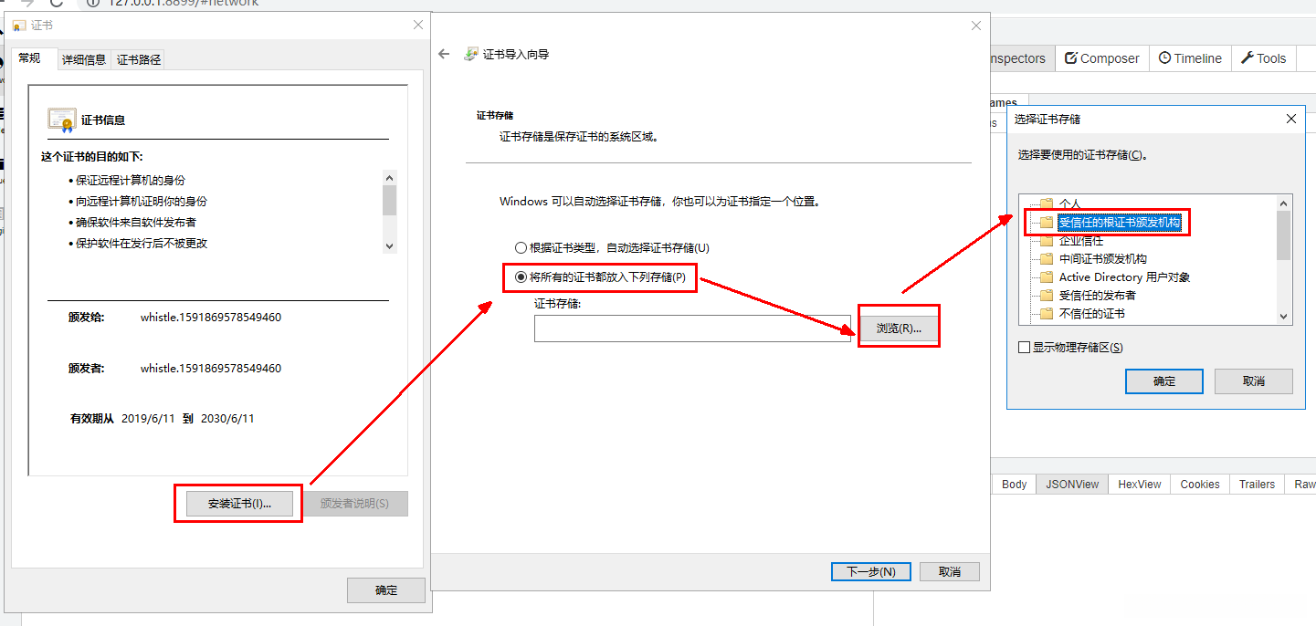 请完成以下步骤:首先获取whistle证书文件,随后完成证书安装步骤,最后将证书存储至...,其中...为受信任的根证书颁发机构。完成所有步骤后即可。
