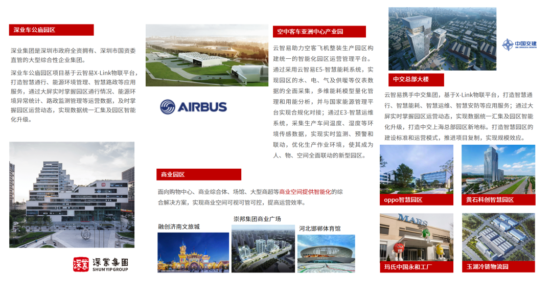 目前云智易智慧园区解决方案已在物流园区、工业园区、生产制造基地以及各类城市空间中成功实施,并为园区运营方、管理者及入驻企业等提供数智化服务。通过数据驱动的决策支持体系帮助用户实现智能化运营管理目标,并致力于打造集规划、设计、管理与服务于一体的智慧园区运营平台。