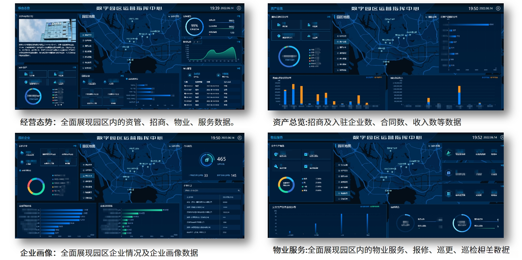 该平台整合展示区内的资产管理相关业务信息(包括但不限于资管业务信息)、招商业务相关信息以及各类服务信息等关键业务领域相关内容,并对这些情况进行整合汇总;全面呈现园区管理与运营的关键数据与重要指标;构建园区管理的综合监控体系;为企业管理部门提供战略规划制定及日常运作支持。