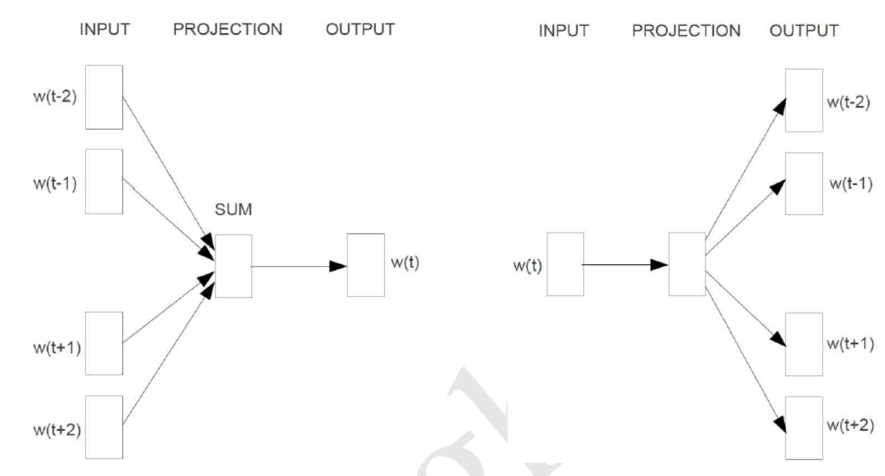 图表四展示了CBOW与Skip-Gram模型的概念框架(参考来源:https://www.jianshu.com/p/d534570272a6)。需要注意的是,在该图表中左侧网络结构中的隐藏层通常采用平均池化(average pooling)进行数据融合。