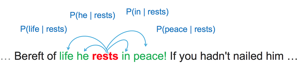 在计算过程中采用固定的采样窗口尺寸,在模型中使用中间词c(center word)去推断环境词o(context words)的位置(如图三所示),或者反过来通过环境词推断中间词的位置(如图四所示)。在遍历整个语料库的过程中,默认我们采取中间词推断环境词的方式来进行建模(即计算条件概率P(o|c))。