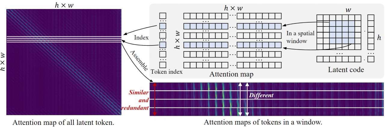 如上图所示,研究团队分析了 在分辨率为512x512情况下self-attention 中的注意力图,然后将位于同一个空间窗口token的注意力图组合到一起,如图右侧所示(其中垂直轴表示窗口中的不同token,水平轴表示窗口内token与所有token的关联程度)。 很明显,同一窗口内不同token的注意力对于空间上距离较远的token几乎是一致的(即,在相同的水平位置,垂直值几乎相同)。而空间相邻的token表现出不同的关注。