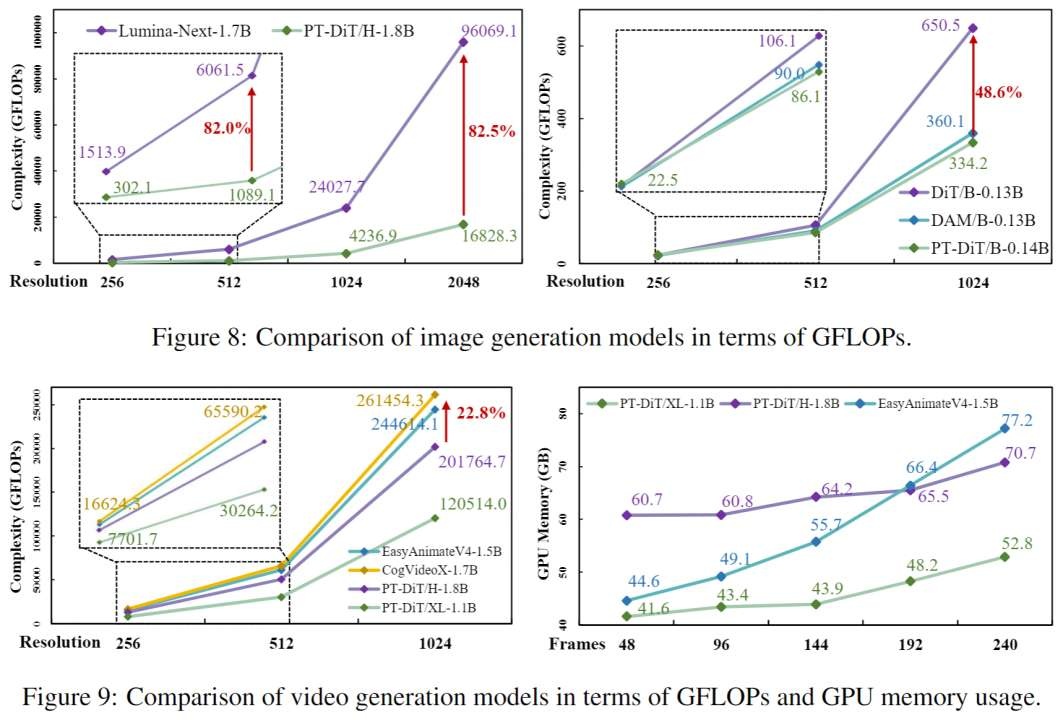 如图所示,无论是图像或视频生成任务,在相同参数规模下,PT-DiT相比现有Diffusion Transformer方法,均有大幅度的计算复杂度优势。同时对比3D full attention建模的EasyanimateV4,其训练显存随着帧数的增加而爆炸增长,而PT-DiT的显存仅有微弱增长,表明PT-DiT有潜力完成更长时间的视频生成任务。