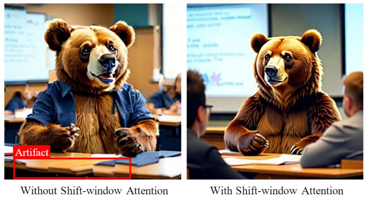 仅有window attention 会导致窗口间token缺乏联系,导致生成图像格子现象明显,如图所示。因此,TCM 中还引入了shift window attention,缓解局部window attention引起的问题。