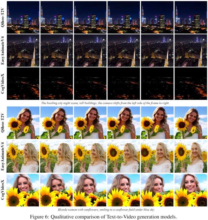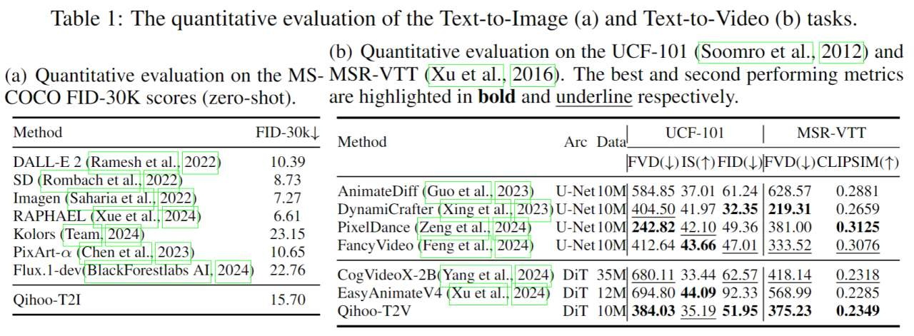 研究团队在MS-COCO FID-30K, UCF-101和MSR-VTT等benchmark上定量评估Qihoo-T2I和Qihoo-T2V,结果表明Qihoo-T2I和Qihoo-T2V均能实现有竞争力的性能,证明了PT-DiT的有效性。