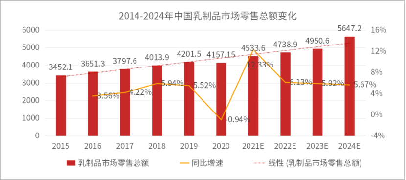 我国乳制品行业起步较晚且 initial stage relatively low, yet has recently shown rapid development. In 2019, the Chinese dairy products retail market achieved a sales volume of 4 trillion yuan, marking a period of gradual slowdown in growth from 2015 onwards. Looking ahead, the dairy products market is expected to maintain steady growth over the next five years, with retail sales potentially reaching 56 billion yuan by 2024.