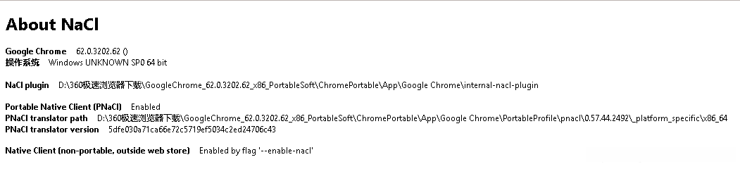 3.在 Chrome 浏览器地址栏中输入"chrome://nacl",检查 nacl 是否启用成功