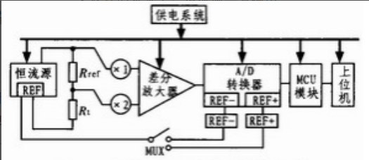 本系统采用三线制恒流源驱动电路来实现对温度传感器的工作控制,在该电路中通过温度传感器将由环境温湿度变化引起的电阻值变化被转换为相应的电压信号。在本文所设计的系统中, 恒流源具备以下特点: 输出电流具有稳定性; 工作环境中的温度相对稳定; 负载端呈现较高的阻抗特性; 同时还能够调节输出电流的方向等关键特性。