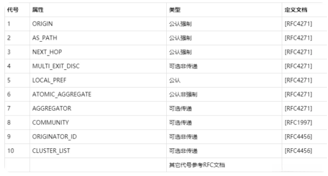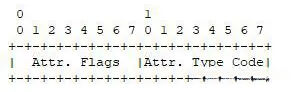- 属性类型(attribute type)占用2个字节空间, 其中第一个字节用于标记功能(flags), 第二个字节用于标识类型代码(code). BGP通过不同属性传递各类信息;