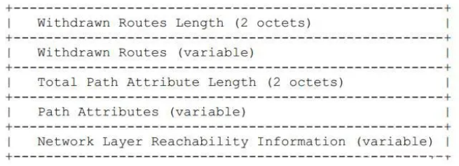 - 路径属性具体说明可参考下文(path attributes are detailed in the next chapter),由三个组成部分构成(attribute type, attribute length, attribute value);