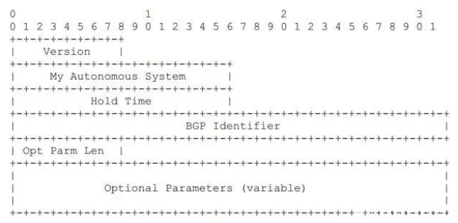 - BGP Identifier(类似于路由器标识符),用于区分不同的BGP设备或路由器建议采用路由器loopback地址作为标识符;