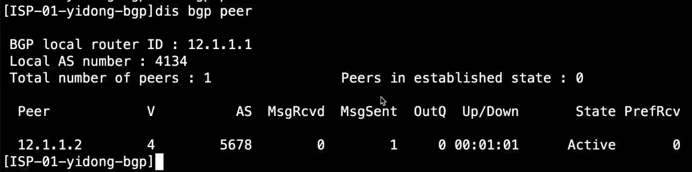 [ISP-01-yidong-bgp]peer 12.1.1.2 as-number 5678