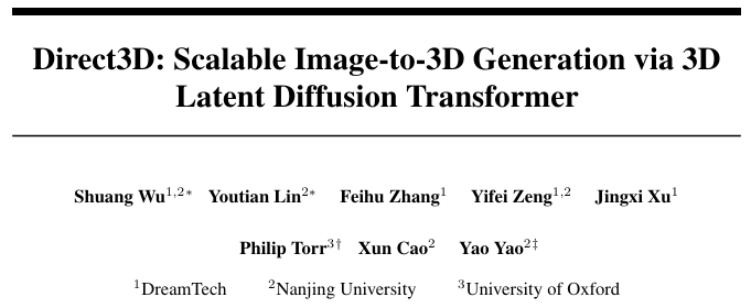 [1] Direct3D: Scalable Image-to-3D Generation via 3D Latent Diffusion Transformer
