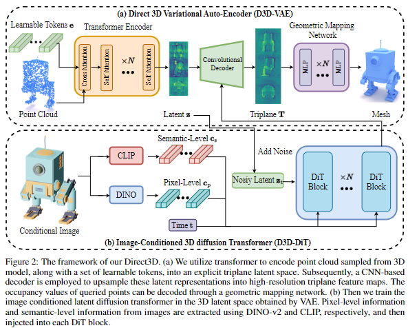 方法包括两个主要组件:Direct 3D Variational Auto-Encoder(D3D-VAE)和 Direct 3D Diffusion Transformer (D3D-DiT)。D3D-VAE高效地将高分辨率3D形状编码到紧凑且连续的三平面潜在空间中。