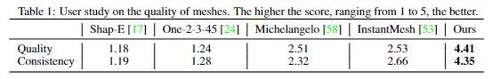 为了确保公平比较,所有方法都使用相同的生成图像作为输入。可以看出,这些基线方法在几乎所有情况下都失败了,而Direct3D仍然能够生成高质量的网格,展示了本文方法的广泛适用性。研究者们还进行了用户研究,以定量比较D3D-DiT与其他方法。渲染了每种方法生成的网格旋转360度的视频,并请46名志愿者根据网格的质量和与输入图像的一致性进行评分。下表1的结果表明,D3D-DiT在网格质量和一致性方面优于其他基线方法。