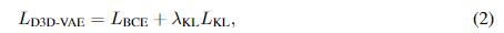 端到端优化 。在训练过程中,从3D空间均匀采样点,并从物体表面附近采样点以预测它们的半连续占据情况。利用二元交叉熵(Binary Cross-Entropy,BCE)损失 L_{BCE} 监督预测。此外,使用 KL 损失 L_{KL} 防止潜在空间中的过度方差。因此, D3D-VAE 通过最小化以下损失进行优化: