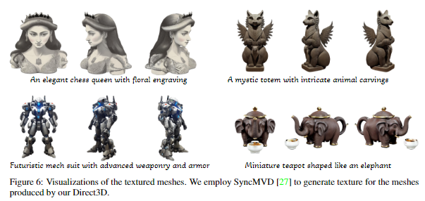 生成纹理网格 。得益于Direct3D生成的平滑和细致的几何形状,可以利用现有的纹理合成方法轻松装饰网格。如下图6所示,使用SyncMVD获得了精美的纹理网格。