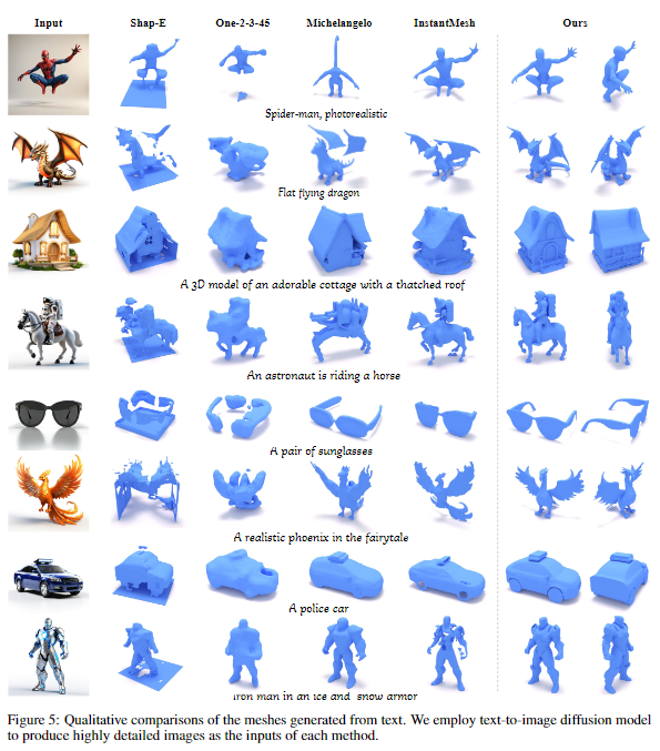 文本到3D 。Direct3D可以通过结合像Hunyuan-DiT这样的文本到图像模型,从文本提示生成3D资产。下图5展示了Direct3D与其他基线方法在文本到3D任务上的定性比较。