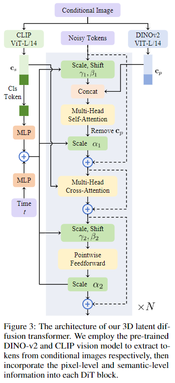 由于获得的潜在embedding是一个显式的三平面表示,一个简单的方法是直接使用一个精心设计的2D U-Net作为扩散模型。然而,这样做会导致三个平面之间缺乏交流,从而无法捕捉生成3D所需的结构化和固有属性。因此,基于 Diffusion Transformer(DiT)的架构构建了生成模型,利用变换器更好地提取平面之间的空间位置信息。同时,我们建议在每个DiT块中合并图像的像素级和语义级信息,从而将图像特征空间和潜在空间对齐,以生成与条件图像内容一致的3D资产。我们的潜在扩散模型框架如前面图2(b)所示,每个DiT块的架构如下图3所示。