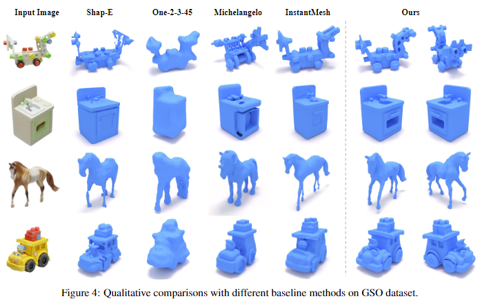 图像到3D 。在GSO数据集上对Direct3D与其他基线方法进行了图像到3D任务的定性比较,如下图4所示。