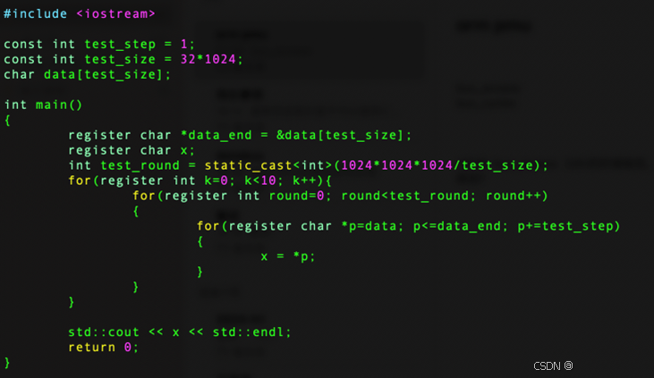 在该程序中,我们进行循环来模拟控制频繁的触发cpu计算指令和预取指令的情况,来统计我们需要统计的指标. 其中我们用register来操作经常需要操作的单元,避免频繁的内存读取变量指令.