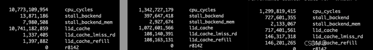 以下分别是step取 1 10 20的对比结果, 使用命令 perf stat -e cpu_cycles,stall_backend,stall_backend_mem,l1d_cache,l1d_cache_lmiss_rd,l1d_cache_refill ./main