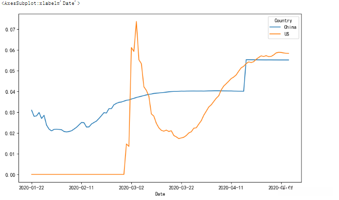 中美两国新冠肺炎病例每日死亡率变化对比,如下: