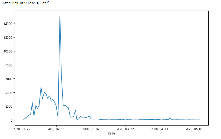 再看中国新增确诊趋势,在2020年初2月初有一个确诊增加高峰,如下:
