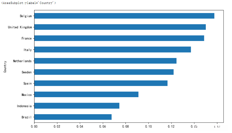 找出确诊病例在1万以上的国家中死亡率排名前十的国家,如下: